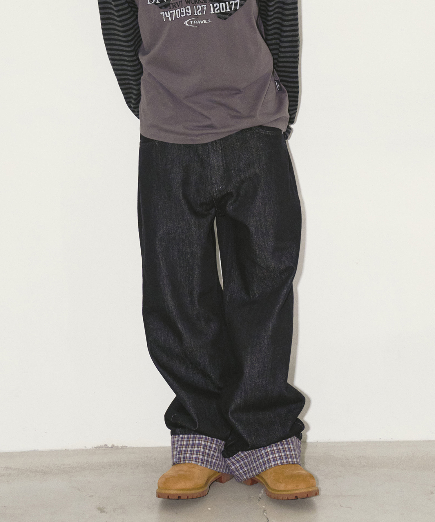 체크 롤업 데님 팬츠 블랙