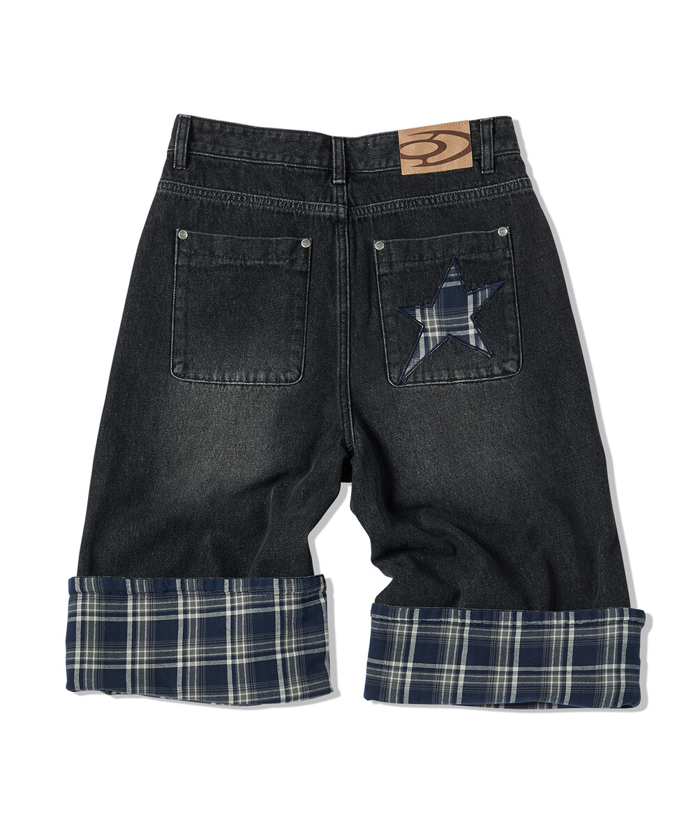 데님 체크 콤비네이션 버뮤다 쇼츠 블랙